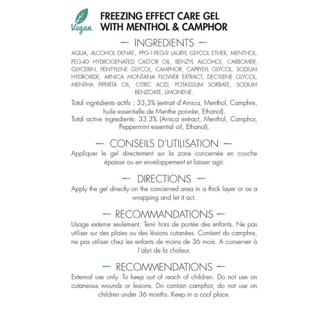 Інгредієнти: очищена вода, спирт денат., ППГ-1-ПЕГ-9 лаурил гліколь ефір, ментол, ПЕГ-40 гідрогенізована касторова олія, бензиловий спирт, карбомер, гліцерин, пентилен гліколь, камфора, каприліл гліколь, натрія гідроксид, екстракт квітів арніки (ARNICA MONTANA), децилен гліколь, ефірна олія м'яти перцевої (MENTHA PIPERITA), лимонна кислота, калія сорбат, натрія бензоат, лімонен.