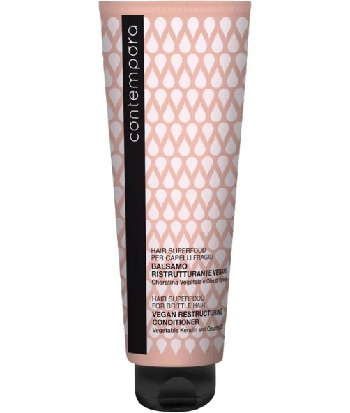 Contempora Vegan Restructuring Conditioner - це кондиціонер для відновлення ламкого та тьмяного волосся, створений на основі рослинного кератину та олії опунції. Унікальна формула живить волосся і шкіру голови, запобігаючи зневодненню, і збільшує вміст кератину в структурі волосся, захищаючи його від пошкоджень.