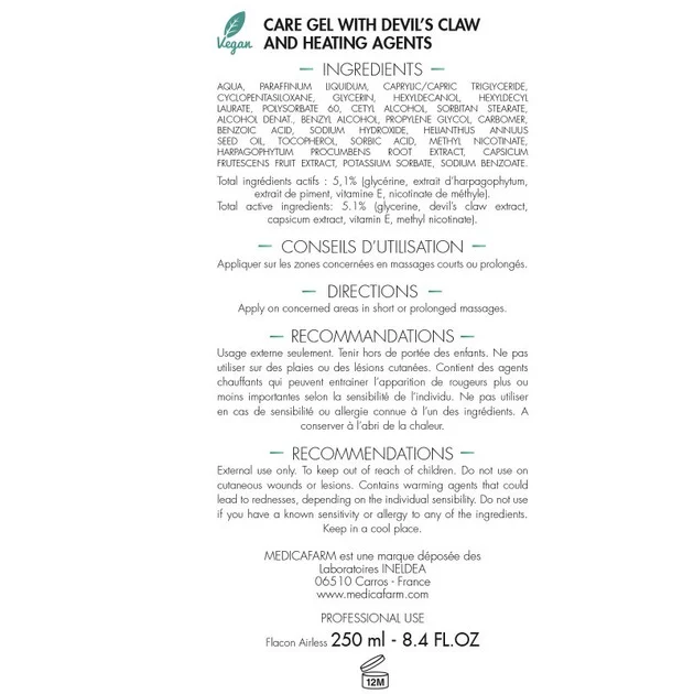 Інгредієнти: очищена вода, вазелінове масло, гліцерин, каприловий каприк тригліцерид, гексилдеканол, гексилдецил лаурат, циклометикон, полісорбат 60, сорбітан стеарат, спирт цетиловий, спирт денат., екстракт гарпагофітуму, екстракт капсікуму, карбомер, бензиловий спирт, токоферол, метил никотинат, пропіленгликоль, натрія гідроксид, сорбат калія, натрія бензоат, метилізотиазолінон, метилхлороізотиазолінон.