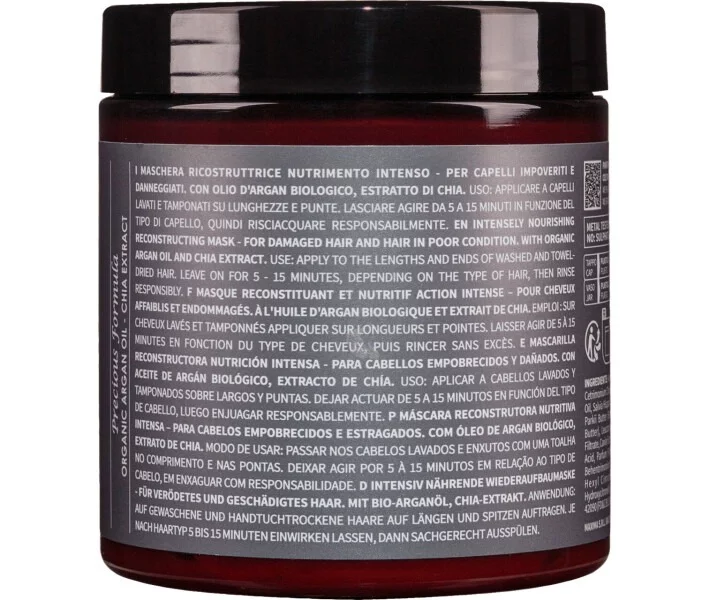 З органічною аргановою олією й екстрактом насіння чіа. Збагачена амінокислотами та рослинними протеїнами з регенерувальними та відновлювальними властивостями. Ідеально підходить для дуже пошкодженого, ослабленого, сухого та пористого волосся як тонкого, так і щільного жорсткого. Живить і зволожує волосся, зміцнює, надає життєву силу й еластичність. Покращує структуру волосся, роблячи його здоровішим.