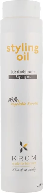 Щоб укладка надовго зберегла свою бездоганну форму, жоден волосок не «втік» із загального ансамблю і не зіпсував вам настрій, використовуйте для створення зачісок чудову олію для стайлінгу з рослинним кератином Krom K Style. Це професійний продукт, який не лише чудово фіксує пасма, а й живить їх, зволожує і захищає від агресивного впливу факторів зовнішнього середовища. Наносити продукт на локони слід по всій довжині перед сушінням феном. Застосовувати його можна до всіх типів волосся. Завдяки легкій консистенції він швидко всотується, не обтяжує пасма. Систематичне нанесення олії значно поліпшить стан волосся, воно буде еластичним, пружним і шовковистим, зможе тривало утримувати задану форму і дивувати довколишніх своєю бездоганністю. Спосіб застосування: нанести засіб на вологе волосся і створити бажаний стиль.