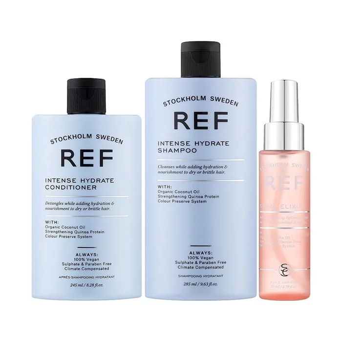 REF Gift Box Intense Hydrate є ідеальним подарунком, який можна презентувати близьким або побалувати себе, будь то свята, день народження або інший особливий випадок. Засоби набору глибоко зволожують, живлять та захищають волосся. Зволожуючі інгредієнти проникають всередину волосяного стрижня, насичуючи його вологою і утримуючи її. Завдяки цьому локони стають гладкими, м'якими та еластичними, набувають природного блиску, життєвої сили, повертають пружність і шовковистість. Яскраві кольори та вишукані деталі цього набору відображають стиль бренду: гарний, природний та захоплюючий дух.