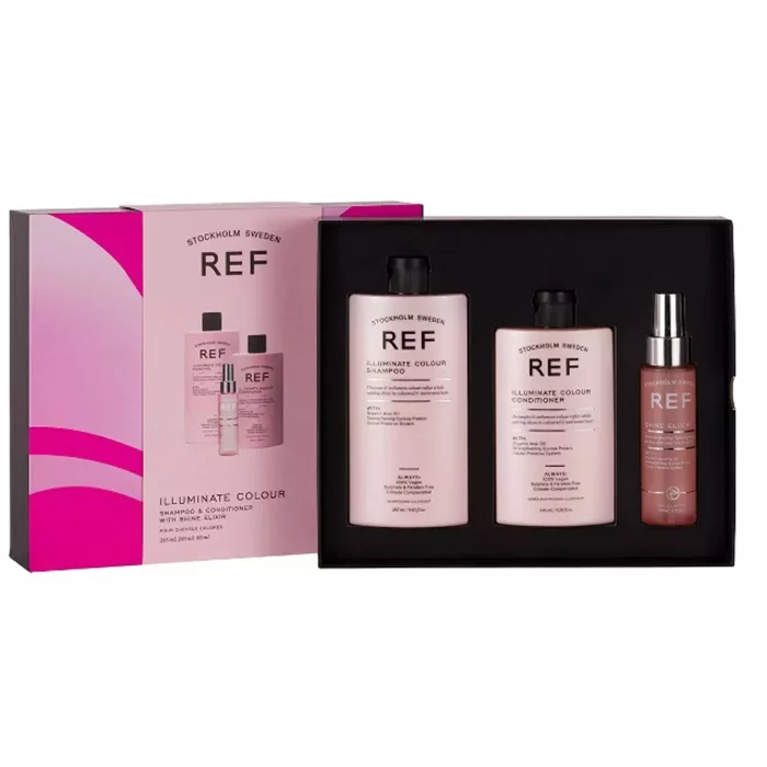 Подарунковий набір REF створений для фарбованого волосся і є ідеальним подарунком, який можна презентувати близьким або побалувати себе, будь то свята, день народження або інший особливий випадок. Продукти набору містять унікальну формулу з рослинними екстрактами, які відновлюють, надають блиск та гладкість волоссю. Крім того, вони містять протеїни та олії, які насичують волосся корисними мікроелементами. Яскраві кольори та вишукані деталі цього набору відображають стиль бренду: гарний, природний та захоплюючий дух.