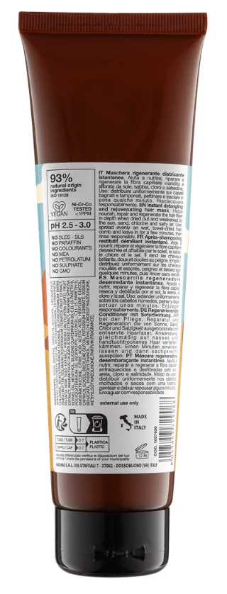 Глибоко живить, відновлює та регенерує волосся, пересушене та пошкоджене внаслідок впливу високих температур, сонця, піску, хлору, вітру, солі та кондиціонування повітря. Завдяки своїй делікатній формулі маска ідеально підходить для всіх типів волосся, навіть найтонших і дитячих.