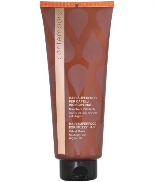 Contempora Velvet Mask - це маска, що відновлює, створена для боротьби з кучерявістю і пухнастістю волосся. Збагачена маслами обліпихи та аргани, вона глибоко живить, зміцнює структуру та відновлює волосся, надаючи їм гладкість та оксамитову м'якість. Рівень pH 4,5 забезпечує делікатний догляд, роблячи волосся легким у укладанні і запобігаючи його пересушуванню.