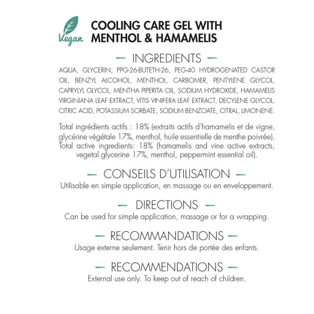 Состав активные вещества: 18% (экстракты гамамелиса и красной лозы, растительный глицерин 17%, ментол, эфирное масло перечной мяты). Без парабенов, без красителей, без ГМО, без продуктов животного происхождения. Гамамелис и красная лоза снимают тяжесть в ногах, стимулируют тонус он и улучшают кровообращение