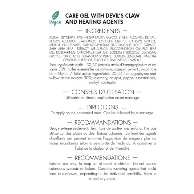 ревматические боли, увеличивают подвижность суставов, обладают противовоспалительными свойствами . очищенная вода, глицерин, ППГ-1-ПЭГ-9 лаурил гликоль эфир, спирт денат., бензиловый спирт, карбомер, пентилен гликоль, каприл гликоль, метил никотинат, экстракт корня гарпагофитума (HARPAGOPHYTUM PROCUMBENS), экстракт каепутового дерева (MELALEUCA LEUCADENDRON CAJAPUTI), эфирное масло листа розмарина лекарственного (ROSMARINUS OFFICINALIS), натрия гидроксид, децилен гликоль, лимонная кислота, калия сорбат, натрия бензоат, эфирное масло листа ямайского перца (PI линалоол.