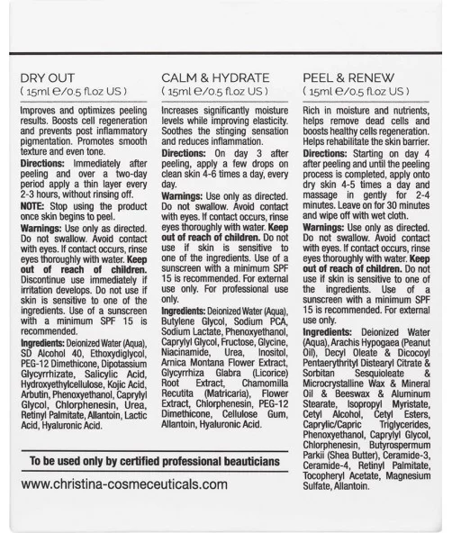 - Dry Out (Подсушивающее средство), 15 мл - поддерживает и усиливает результат пилинга, стимулирует обновление/регенерацию и восстановление клеток. Уменьшает проявления гиперпигментации и ускоряет процесс заживления. Обеспечивает оптимальное проникновение активных компонентов, стимулирует обновление клеток и выработку коллагена, отвечает за отшелушивание, обладает антибактериальными свойствами, – стимулирует синтез коллагена, предупреждает появление воспалительных процессов, обладает антибактериальными, противомикробными и антисептическими свойствами.