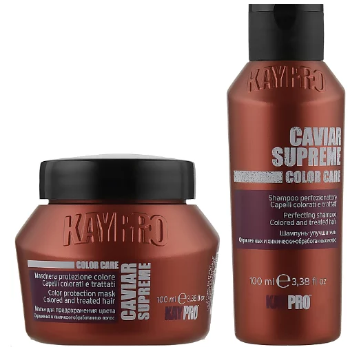 Состав набора: шампунь с икрой для окрашенных волос KayPro Special Care Caviar Supreme Shampoo, 100 мл + маска с икрой для окрашенных волос KayPro Special Care Caviar Supreme Mask, 100 мл
