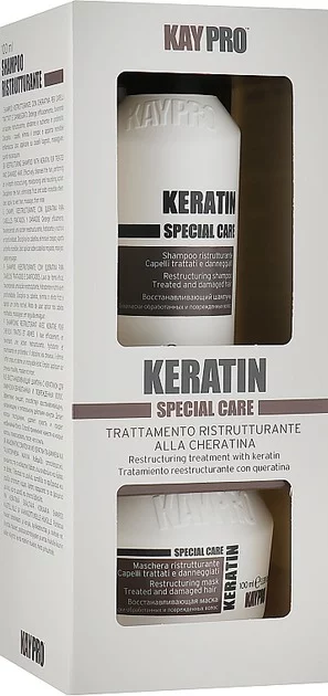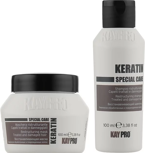 Состав набора: Шампунь с кератином - KayPro Special Care Keratin Shampoo, 100 мл + Маска с кератином для волос - KayPro Special Care Keratin Mask, 100 мл.