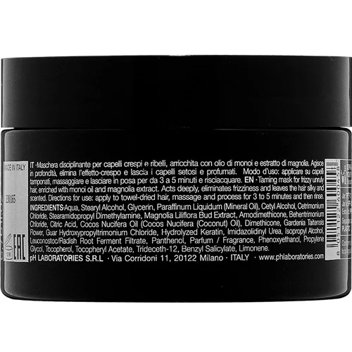 Маска для укрощения пушящихся непослушных волос. Обогащена маслом моной и экстрактом магнолии. Проникает глубоко в структуру, устраняет пушистость, делает волосы мягкими и шелковистыми. Оставляет на волосах легкий, приятный аромат. Активные ингредиенты: – Масло моной • богата витамином Е, сокращает образование свободных радикалов и замедляет процессы старения. Питает, увлажняет и кондиционирует волосы, облегчает расчесывание, придает блеск и мягкость, уменьшает пушистость. Масло моной также оказывает защитное действие, препятствует потере влаги, предотвращает ломкость волос и образование секущихся кончиков. - экстракт магнолии • содержит фенольные соединения, в том числе магнолол и хонкиол, которые являются мощными антиоксидантами с успокаивающими и увлажняющими свойствами. Они способствуют повышению эластичности волос, защищают структуру, делают их здоровыми и блестящими. Аромат: Верхние нотки • восточные • аромат строится вокругизящного медового аккорда, дополненного нотами красных апельсинов и чувственных белых цветов. Средние нотки • цветочные груша и жасмин добавляют лета в композицию. Базовые нотки • ваниль • нотки ванили, пачули и элегантного белого мускуса придают полноту аромату. Применение: нанесите на чистые, подсушенные полотенцем волосы массирующими движениями, выдержите 3-5 минут. Смойте.