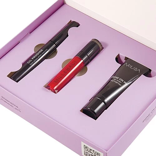 Состав набора: Nouba Cil Prodige — Черная тушь для ресниц, 9 мл Суперобъемная экстрагментированная тушь создает эффект накладных ресниц. Она легко наносится и медленно высыхает, чтобы можно равномерно нанести несколько слоев. Удобная щеточка с волнистой формой щетины позволяет моделировать ресницы. Нанесенная тушь отлично держится в течение дня, не размазывается и не осыпается. Формула на основе натуральных восков обогащена пантенолом, который известен своими восстановительными свойствами. В составе нет аллергенов, триэтаноламина и ароматизаторов. Продукт офтальмологически протестирован. Nouba Millebaci N.7 - Красная губная помада, 6 мл Великолепная жидкая помада алого цвета с мягким матовым финишем. Формула обогащена витамином Е и маслом огурца, успокаивающим и смягчающим чувствительную кожу губ. Помаду с нежным ароматом ванили легко наносить, через несколько секунд она высыхает и долго держится, устойчива к поцелуям и не оставляет.следы на чашках. Бьюти-продукт дерматологически протестирован, не содержит аллергенов и парабенов. Nouba Shine On Me - Хайлайтер для лица и тела, 30 мл Хайлайтер в удобной форме шелковистого флюида. Благодаря перламутровым микрочастицам разного размера он подсвечивает кожу и дарит ей нежное сияние. На 90% натуральная формула содержит аллергенов и ароматизаторов, а также ингредиентов животного происхождения. Набор Shine On Me Beauty Box Red выпускается в красивой подарочной коробке, принт для которой создал молодой итальянский художник Le Pupine.