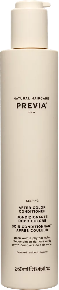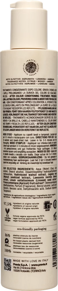 Natural Haircare Previa Keeping After Color Conditioner Кондиционер для окрашенных волос с фитокомплексом зеленого грецкого ореха. Действует на поверхность, увлажняя волосы. Запечатывает кутикулу, удлиняет цветостойкость и помогает сохранить блеск. Мгновенно придает волосам мягкость и шелковистость. Не отягощает и не оставляет следы. 97,5% ингредиентов натурального происхождения и ингредиентов, полученных органическим земледелием. СОДЕРЖИТ: - Фитокомплекс зеленого грецкого ореха: богатый фенолом с высоким молекулярным весом, который образует на волосах сетевую структуру, состоящую из протеинов и обеспечивает антиоксидантную защиту и защиту цвета даже после ополаскивания. - Экстракты лавсонии, семян льна и абрикоса: обладают антиоксидантными свойствами, защищают волосы от УФ-лучей, придают им блеск и обеспечивают увлажнение. ДЕЛИКАТНАЯ ФОРМУЛА Содержит совместимые с кожей и экологически чистые ингредиенты растительного.происхождение Без агрессивных химических веществ Без искусственных красителей Без ингредиентов животного происхождения Сертифицировано AIAB | Vegan Quality | Протестировано на содержание никеля Экологически безопасная упаковка PE GREEN — биопластик из возобновляемых источников (сахарный тростник). На 100% пригодна для вторичной переработки. НОТКИ АРОМАТА: аромат создан из цветочных, цитрусовых и деликатных ноток, завернутых в блеск, мягкость и элегантность. Верхние нотки розы и мандарина смешаны со средней ноткой кедрового дерева и завернуты в теплый аромат янтаря и ландыша. Верхние нотки • цитрусовые| средние нотки • деревянные| базовые нотки • амбровые