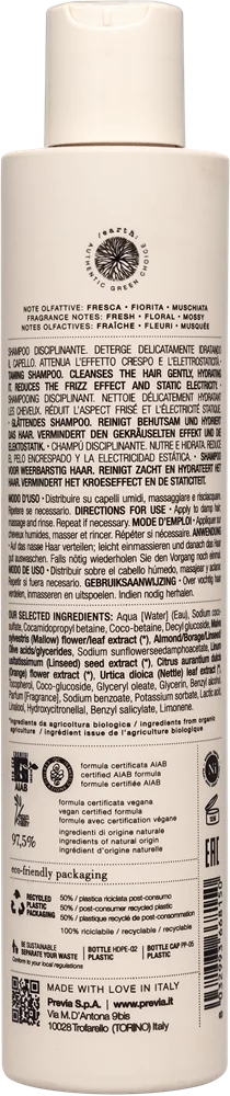 Natural Haircare Previa ALMOND&LINSEED OIL Taming Shampoo Sleek hair Шампунь для укрощения волос С органическим экстрактом миндаля и маслом семян льна. Шампунь мягко очищает и увлажняет волосы. Уменьшает завывание и наэлектризованность. СОДЕРЖИТ: - Экстракт миндаля - масло высвобождает всю энергию содержащихся в миндале энзимов и делает его инновационным фитокомплексом, в состав которого входят жирные монокислоты и диглицериды. Усиливает упругость и увлажнение. - Масляный экстракт льняных семян – масло активирует энзимы, превращая экстракт в инновационный фитокомплекс, содержащий моножирные кислоты и диглицериды. Усиливает эффект увлажнения и эластичности. НОТКИ АРОМАТА: мягкий бриз аромата белых лепестков постепенно опускается на вас, раскрывая красоту мечты. Прекрасный аромат цветков апельсина открывает дверь в рай, на мускусный путь.