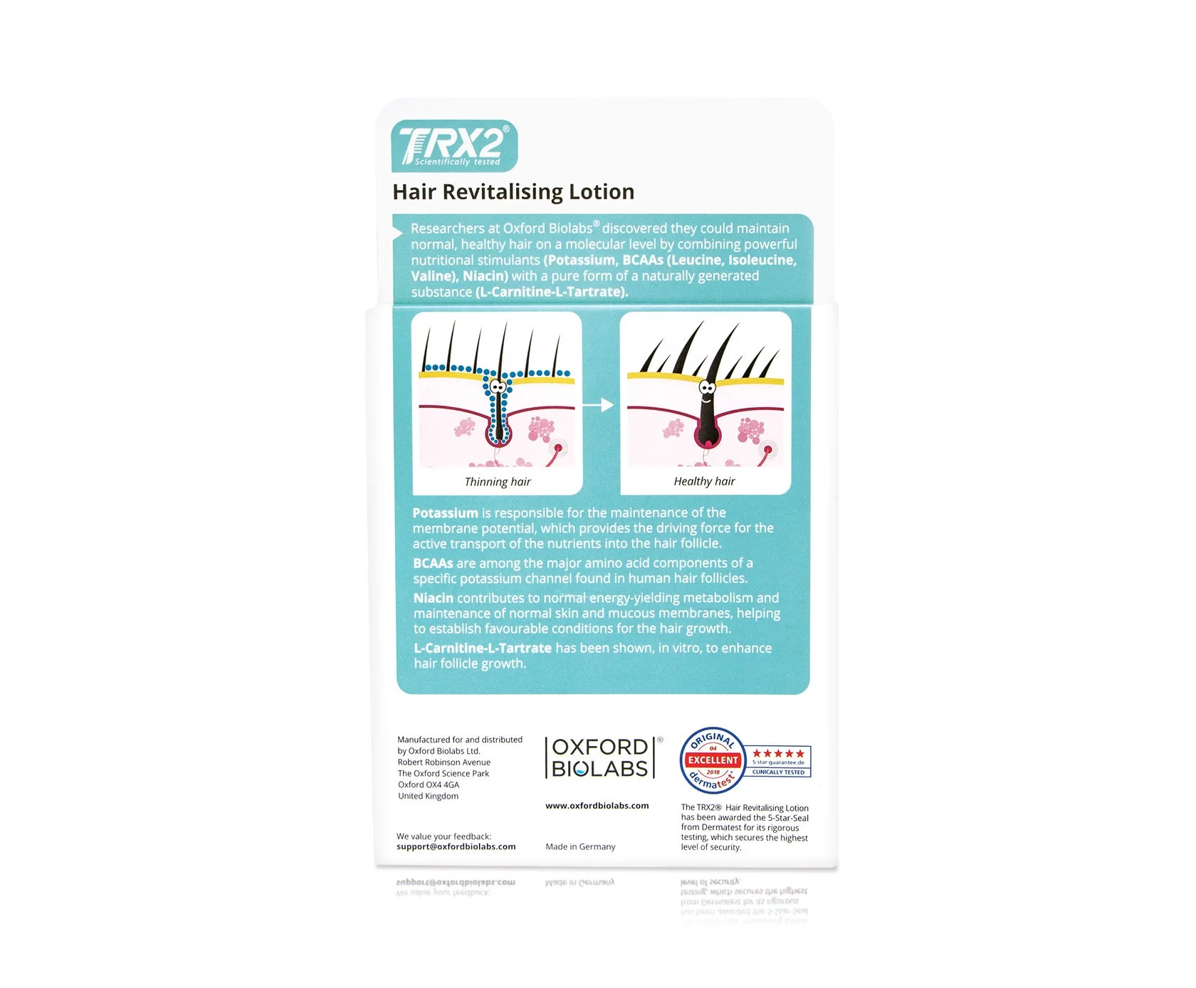 Лосьон TRX2® создан для восстановления волосяных фолликул и питания жидких волос. Основой TRX2® Лосьона является та же эффективная формула, используемая в TRX2® Молекулярной пищевой добавке для волос. Для мужчин и женщин, наблюдающих потерю волос на ранних стадиях (шкала Норвуда 1–4). Не содержит вредных компонентов. Не содержит синтетических ароматизаторов и красителей. Протестирован под дерматологическим контролем немецким институтом дерматологии Dermatest® в 2018 году. Не тестировано на животных Применение Наносите TRX2® Лосьон на кожу головы с помощью пипетки дважды в день: утром и вечером. Не требует смывания. Для обеспечения длительного результата используйте TRX2® Лосьон систематически. Эффективно сочетается с другими продуктами из линейки TRX2®. Состав Аква, Карнитин тартрат, Пропанедиол, Феноксиетанол, Биотин, Леуцин, Изолецин, Валин, Ниацин, Потассиум хлорид, Цинк Цират, Диметил Сульфон. Без синтетических ароматизаторов икрасителей. Предостережение При контакте с глазами немедленно промойте их холодной водой. При возникновении непредсказуемого сильного раздражения прекратите использование лосьона и обратитесь к врачу. Хранить в недоступном для детей месте. Исключительно для наружного использования. Срок годности: 30 месяцев Условия хранения: при комнатной температуре. Не использовать по истечении срока годности. Избегайте попадания прямого солнечного света.