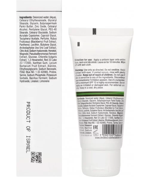 Способ применения: нанесите равномерным слоем на все лицо, шею и зону декольте. Оставить на 10 мин. Удалить влажной салфеткой.