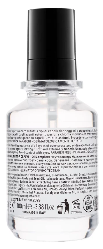 Серум для надання блиску всім типам пошкодженого або надмірно обробленого волосся. Запечатує посічені кінчики та захищає волосся від несприятливих зовнішніх факторів, робить його м'яким і надзвичайно гладким.