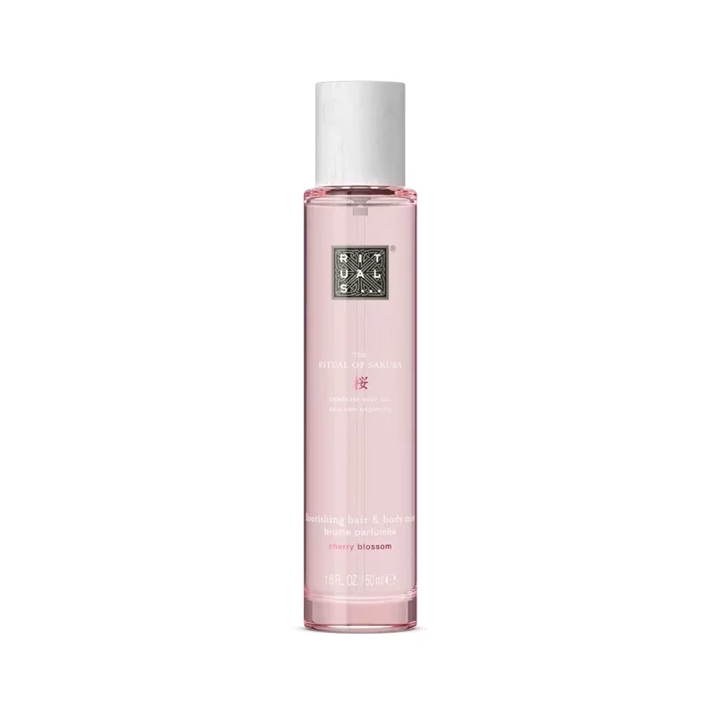 Огорніться ароматом спрею для волосся та тіла The Ritual of Sakura. Збагачена вишневим цвітом і рисовим молоком, безалкогольна формула сприяє відчуттю оновлення; він також підходить для чутливої шкіри та безпечний для тканин.