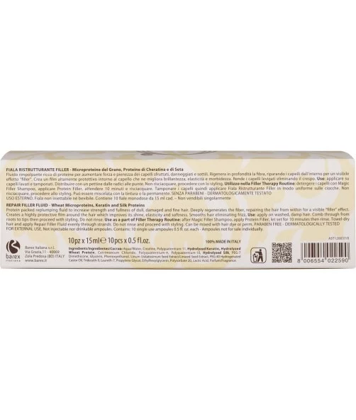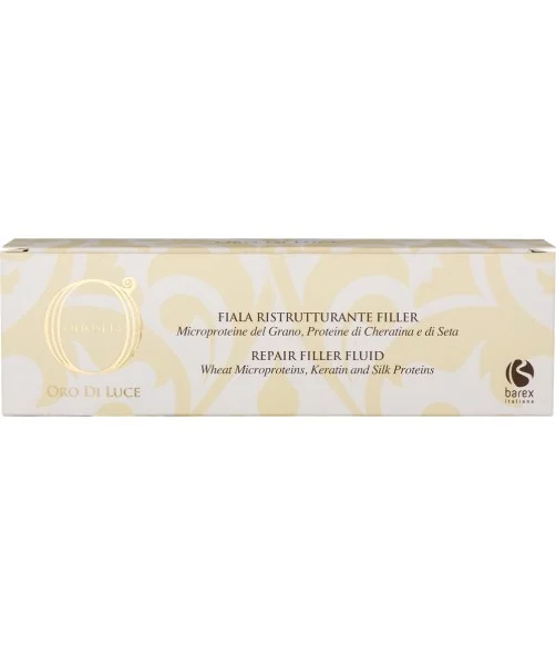 Barex Olioseta Oro Di Luce Repair Filler Fluid — незмивний філлер-флюїд для відновлення та ущільнення тонкого, пошкодженого або ослабленого волосся. Завдяки мікропротеїнам пшениці, кератину та шовковим білкам формула проникає глибоко в структуру, зміцнюючи волосяне волокно, даруючи йому щільність, еластичність та гладкість.