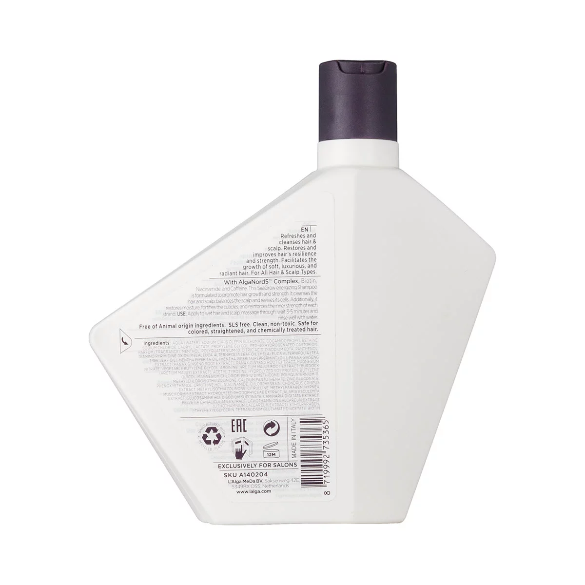Освіжає й очищає волосся та шкіру голови. Відновлює й покращує еластичність волосся, надає йому силу. Сприяє росту м'якого, розкішного й сяючого волосся. Формула з комплексом AlgaNord5 ™, біотином, ніацинамідом і кофеїном делікатно очищає волосся й шкіру голови від надлишків шкірного жиру та лупи. Відновлює природний баланс шкіри голови й стимулює оновлення клітин. Шампунь насичує волосся вологою, зміцнює кутикулу й підвищує внутрішню міцність кожного пасма. Підходить для всіх типів волосся і шкіри голови.