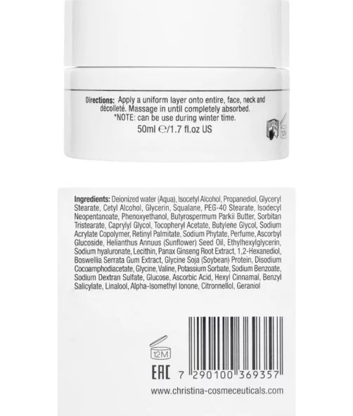 Живильний крем, збагачений незамінними ліпідами, антиоксидантами, вітамінами та іншими поживними речовинами. Бореться із вільними радикалами та розгладжує текстуру. Підвищує еластичність та зволоженість, робить шкіру наповненою, здоровою та сяючою.
