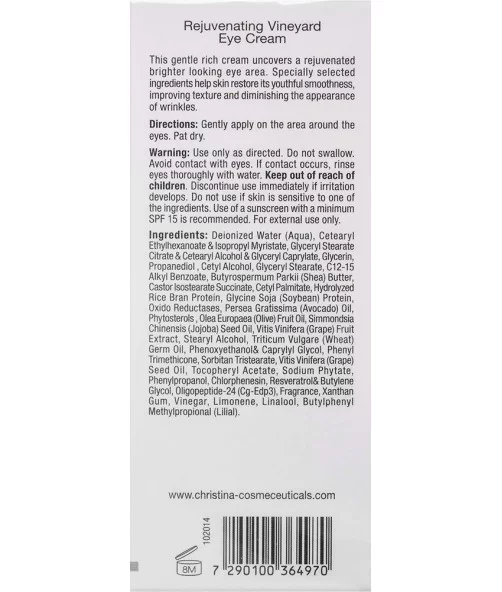 Ніжний омолоджувальний крем, делікатно відновлює шкіру навколо очей, роблячи її м'якшою, рівною і гладкою. Сhateau de Beaute Rejuvenating Vineyard Eye Сreаm підвищує еластичність шкіри та розгладжує мімічні зморшки. Шкіра навколо очей виглядає гладенькою, молодою та сяючою.