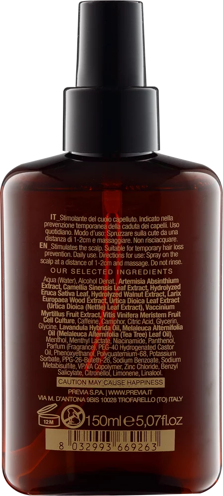 Лосьйон-спрей, який стимулює шкіру голови та запобігає випадінню волосся. Збагачений органічним абсентом (полином) і стовбуровими клітинами винограду. Для щоденного використання.