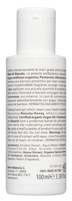 Антисептический гель для рук на основе 70% спирта и меда манука, являющегося мощным природным антибактериальным средством. Мгновенно очищает и дезинфицирует кожу рук, сохраняя ее гидробаланс. Сертифицированное органическое аргановое масло, пантенол, аллантоин и глицерин формируют защитный барьер, обеспечивая коже рук увлажнение и придавая им мягкость.
