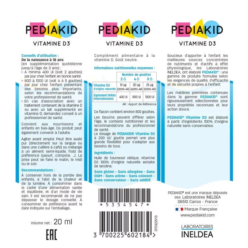 PEDIAKID НАТУРАЛЬНЫЙ ВИТАМИН D3 - ТОЧНАЯ ДОЗИРОВКА / VITAMINE D3, 20 мл