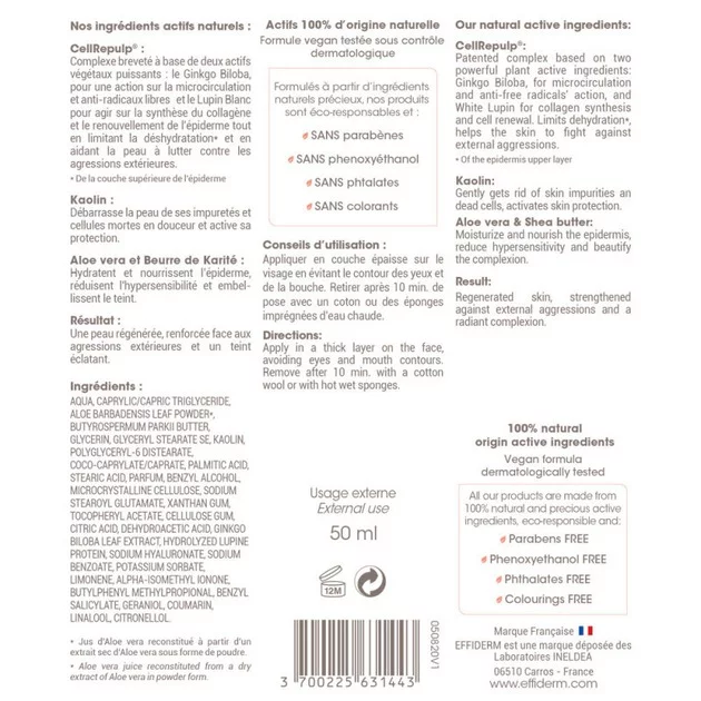 Действие: стимулирует процесс регенерации кожи. Каолин мягко очищает кожу от загрязнений и отмерших клеток, а также активирует защитные функции. Алоэ вера и масло ши увлажняют и питают эпидермис, для снижения гиперчувствительности и сухости кожи, а также придают лицу здоровый цвет. Комплекс CellRepulp активизирует регенерацию эпидермиса и усиливает защиту от внешних агрессий. Проблемная, чувствительная и подверженная реакциям кожа приобретает комфорт и свежесть. Для любого типа кожи.