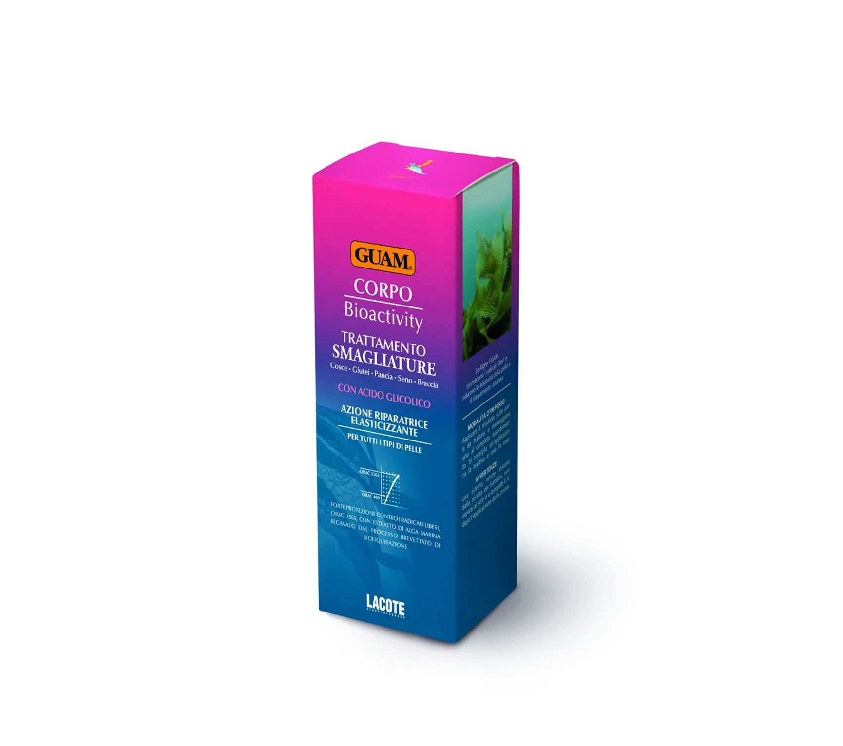 Активные компоненты: Водоросли Guam борются с действием свободных радикалов, противостоят потере эластичности кожи. Гидрогликолевый экстракт бурой водоросли Gelidium sesquipedale содержит минералы, олигоэлементы и аминокислоты, улучшает уровень увлажненности, питает и восстанавливает кожу, улучшает ее эластичность. Гликолевая кислота (альфа – гидроксикислоты, АНА) способствует восстановлению гладкости кожи, уменьшению и осветлению уже существующих на коже растяжек, стимулирует синтез коллагена.