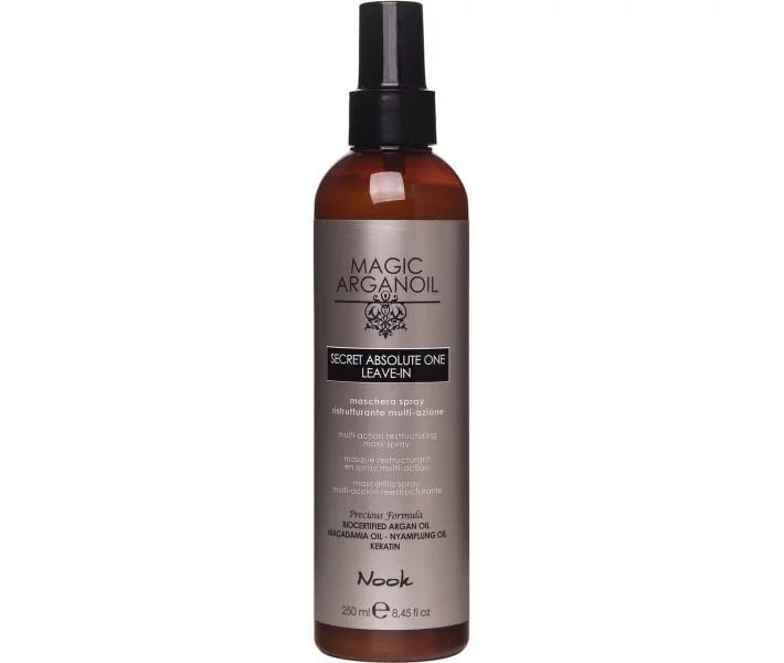 NOOK MAGIC ARGANOIL SECRET Absolute One Leave-in multi-action restructuring mask spray КОНЦЕНТРОВАНАЯ МУЛЬТИАКТИВНАЯ МАСКА-СПРЕЙ, что реструктурирует. С УФ-фильтром. Формула средства с активными ингредиентами: кератин, био-аргановое масло, масло макадамии и ниамплунг. Идеально для повседневного использования.