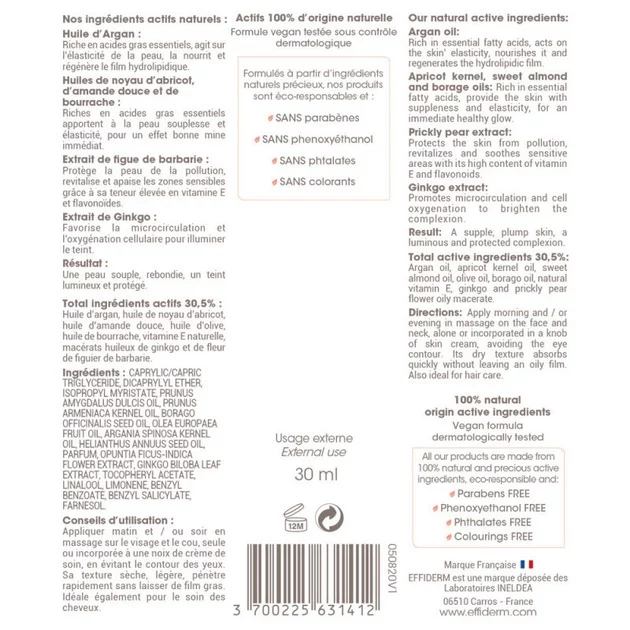 Ингредиенты: каприловый каприк триглицерид, дикаприловый эфир, изопропил миристат, масло сладкого миндаля, масло ядер косточек абрикоса, масло семян свекольника, масло масла, масло ядер ореха аргании спинозы, масло подсолнечника, натуральное масло листа гинкго билоба, токоферол ацетат, линалоол, лимонен, бензил бензоат, бензил салицилата, фарнезол.