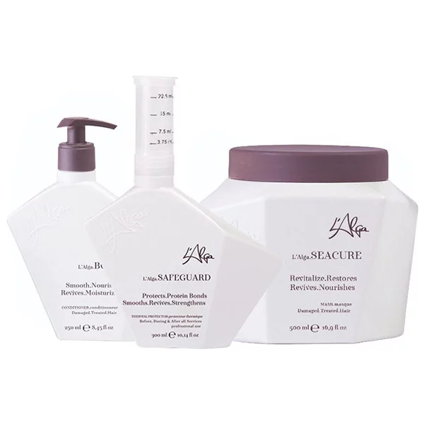 В состав набора входят: кондиционер, 250 мл, маска, 500 мл и уход З00 мл. Каждый день наши волосы подвергаются воздействию различных внешних факторов, негативно влияющих на их состояние. L'alga – это линия для восстановления и питания всех типов волос. Средства L'alga защищают волосы от негативного воздействия окружающей среды, ежедневного стресса, ультрафиолетовых лучей, сухости и горячей укладки, сохраняя тем самым естественную жизненную силу и эластичность. Эти продукты не содержат парабенов, синтетических красителей, спирта, нефтепродуктов, фталатов, солей, ГМО и SLES. Кондиционер для волос L'Alga "Boost Conditioner", 250 мл Для поврежденных волос. Кондиционер для волос с легкой текстурой дополнен биотехнологическим комплексом AlgaNord 5, интенсивными увлажняющими и восстановительными компонентами, биотином и комплексом витаминов группы В, защищающим волосы. Средство укрепляет структуру изнутри. Имеет богатый склад, благодаря уникальнойкомбинации водорослей, он смягчает даже очень жесткие волосы. Наполняет влагой, придает ему энергию и улучшает кровообращение кожи головы. Восстанавливает поврежденные волосы и закрывает кутикулу, делая их более яркими, гладкими, мягкими и здоровыми. Продукт не содержит спирт, сульфаты и парабены. Маска L'Alga "Seacure Masque", 250 мл Для поврежденных волос. Обогащена биотехнологическим комплексом AlgaNord 5, сбалансирует pH кожи головы и восстанавливает волосы изнутри. Насыщает влагой, придает волосам силу и эластичность. Био-защитный комплекс в формуле маски, содержащий биотин и ниацинамид, глубоко проникает в волосы и восстанавливает их, глубоко питая и укрепляя как изнутри, так и снаружи. Улучшает кровообращение кожи головы и восстанавливает волосяные фолликулы. Комплекс AlgaNord 5 восстанавливает ослабленные волосы и придает им эластичность. Оно становится более ярким, мягким, гладким, блестящим и приобретает объем. Продукт не содержит спирт, сульфаты ипарабены. L'Alga.SelfSafeGuard уход 300мл Предохраняет волосы до, во время и после химической обработки от любых повреждений. Восстанавливает поврежденные кератиновые связи после каждой химической обработки. THERMAL PROTECTOR обеспечивает волосам силу, мягкость, гладкость и шелковистость после каждой технической процедуры. С комплексом Alga Nord 5 Защита волос необходима, так как их красота и здоровье постоянно подрываются ежедневной укладкой, повреждающей структуру и внутренние кератиновые связи. Без постоянной защиты целостность, крепость, блеск и мягкость волос исчезают через 3-5 недель (в зависимости от способа обработки волос). Использование L'Alga.SelfSafeGuard гарантирует жизнеспособность волос, плотную структуру, целостность, мягкость и блеск. БЕЗ сульфатов и парабенов.
