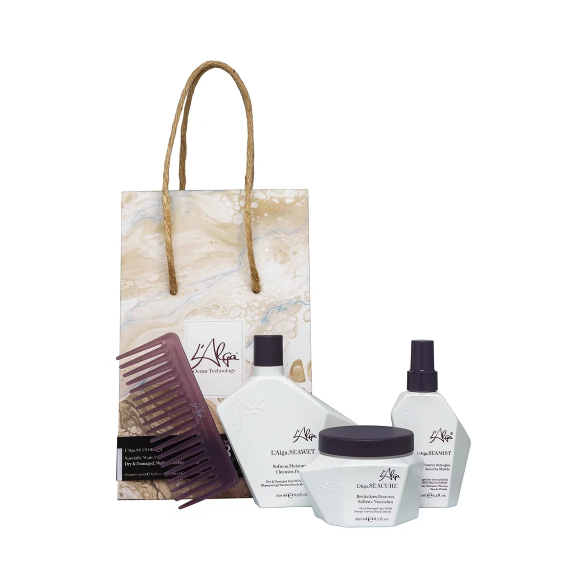 L’Alga Seawet Shampoo 250 ml + L’Alga Seacure Mask 250 ml + L’Alga Seamist Moisture Spray 100ml + L’Alga Comb В состав набора входят: L’Alga Seawet Shampoo Шампунь оздоровительный Освежает, восстанавливает влагу, повышает мягкость, укрепляет и оздоравливает волосы и кожу головы. Подходит для повседневного применения. С комплексом AlgaNord5™ Омолаживающий шампунь SEAWET сочетает в себе биотехнологический комплекс AlgaNord5™ с глубоко увлажняющими и восстановительными ингредиентами, которые укрепляют каждую прядь и питают кожу головы. Мягко очищает волосы, восстанавливает баланс влаги в его структуре. Очищает кожу головы, не удаляя естественный кожный жир, одновременно улучшая кровообращение. Мгновенно восстанавливает поврежденные волосы, которые выглядят более молодыми, гладкими и здоровыми с каждым мытьем, устраняет пушистость. НЕ СОДЕРЖИТ СУЛЬФАТЫ И ПАРАБЕНЫ L’Alga Seacure Mask Маска восстанавливающая интенсивного действия Наполняет влагой, повышает мягкость, придает волосам эластичность, гладкость, блеск и объем.Делает волосы более сильными и здоровыми с каждым применением. Наполняет энергией и восстанавливает баланс влаги в структуре волос, питает кожу головы. С комплексом AlgaNord 5™ По-настоящему современное средство SEACURE MASK проникает в фолликулы с биотехнологическим комплексом AlgaNord 5™, чтобы сбалансировать кожу головы, усилить внутреннюю прочность каждой пряди и восстановить каждое волокно. Биозащитный комплекс, включающий биотин и ниацинамид, восстанавливает повреждения, проникая в волосы, глубоко питает и укрепляет стержень изнутри. Стимулируя кровообращение кожи головы и омолаживая фолликулы, AlgaNord 5™ восстанавливает чрезмерно обработанные волосы с каждой дозой, улучшая его эластичность. Придает мягкость, блеск и плотность. Идеально подходит для поврежденных и зрелых волос. Подходит для любого типа волос. НЕ СОДЕРЖИТ СУЛЬФАТЫ И ПАРАБЕНЫ НЕ СОДЕРЖИТ АЛКОГОЛЬ L’Alga SEAMIST MOISTURIZING SPRAY Спрей против пушистости волос несмываемтермозащитный Увлажняющий спрей. Несмываемый. Подготовка волос к укладке. Распутывает и увлажняет. Кондиционирует, разглаживает, питает, укрепляет, улучшает структуру, защищает волосы и кожу головы. Лишает пушистости. Защищает волосы от повреждений во время горячей укладки. С комплексом AlgaNord 5™ Уникальная процедура SEAMIST MOISTURE SPRAY насыщает влагой даже самые сухие волосы, придает блеск и защищает от высушивания и других повреждений, которые могут быть вызваны нагреваемыми приборами и воздействием ультрафиолетовых лучей. Био-восстановительный комплекс, включающий в себя Alga Nord 5™, биотин и ниацинамид, устраняет нанесенный волосам вред, проникая вглубь волос, придает ему мягкость, гладкость и облегчает расчесывание. Эффективная формула без ополаскивания защищает волосы от воздействия высоких температур (до 450°F/230°C), ультрафиолетовых лучей и образования статического электричества. НЕ СОДЕРЖИТ СУЛЬФАТЫ И ПАРАБЕНЫ НЕ СОДЕРЖИТ АЛКОГОЛЬ