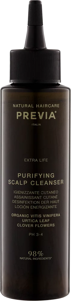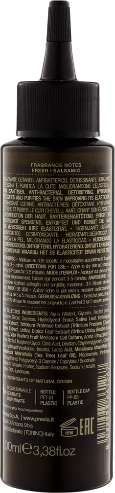 Natural HairCare Previa Extra Life Purifying Scalp Cleanser СРЕДСТВО ДЛЯ ОЧИЩЕНИЯ КОЖИ ПРЕДСЕДАТЕЛЯ Оказывает антисептическое и антибактериальное действие. Детокс. Бережно очищает кожу головы, увлажняет, повышает тонус и эластичность. Стимулирует обновление клеток и способствует насыщению кожи головы кислородом. Восстанавливает естественный баланс микрофлоры кожи головы. PH 5.5-6.5 СОДЕРЖИТ: Эссенциальное масло чайного дерева – себорегулятор, антибактериальное и противогрибковое средство, борется с неприятными запахами. Это прекрасное очищающее, смягчающее и заживляющее средство кожу головы. 3HC-СТИМУЛИРУЮЩИЙ КОМПЛЕКС - сертифицирован ICEA. Комплекс 3-х активных ингредиентов: стволовых клеток винограда, биосжиженных семян рукколы и биосжиженных зеленых грецких орехов. 3hc-стимулирующий комплекс помогает уменьшить и предотвратить выпадение волос, увеличивая его жизненный цикл. Органический экстракт крапивы – сертифицирован ICEA. Обладает связующими и заживляющими свойствами. Стимулируетмикроциркуляцию кожи головы, улучшает клеточный метаболизм и способствует поступлению питательных веществ в волосяной фолликул. БЕЗ DEA / TEA - EDTA / PEG / PPG - ПАРАБЕНОВ - ТИАЗОЛИНА - ИСКУССТВЕННЫХ КРАСНИКОВ - МИНЕРАЛЬНЫХ МАСЛО - СИЛИКОНОВ