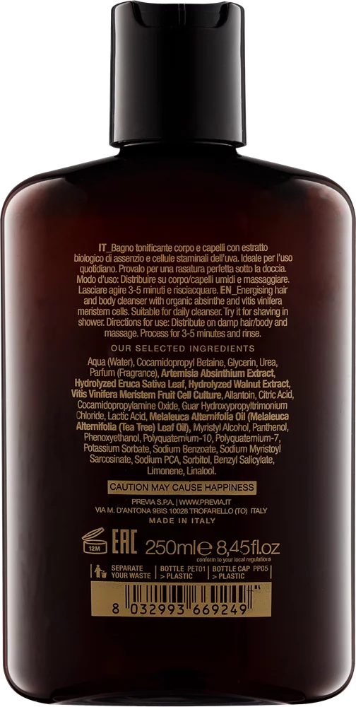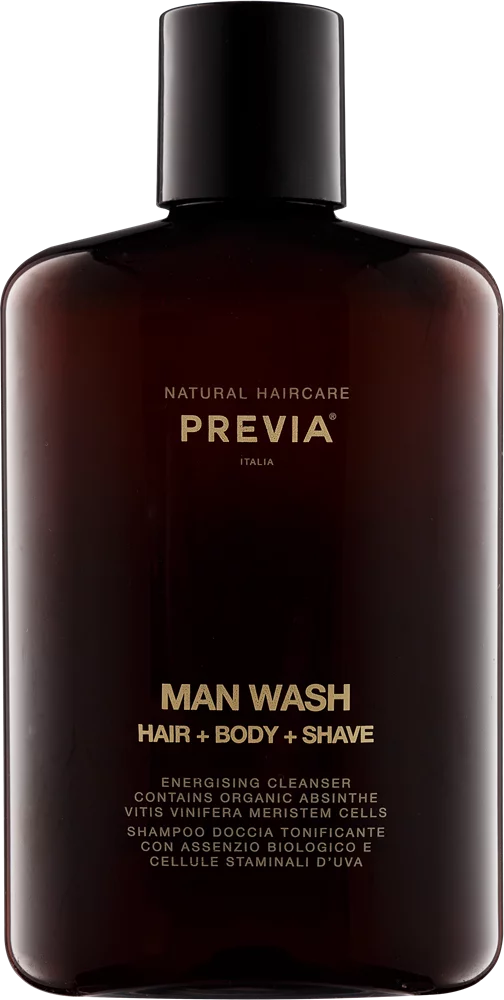 Natural Haircare Previa Man Wash Hair+Body+Shave MAN WASH волосы+тело+бритье Очищает, тонизирует и придает энергию. Содержит органический экстракт абсента (полынь) и стволовые клетки винограда. Идеально подходит для повседневного применения. Нотки аромата: это уникальное путешествие к сердцу природы. Престижные и постоянные нотки натуральных элементов. Фруктовые эссенции мандарина и бергамота открывают аромат, прокладывая путь к магнолии, а также открывают основные ноты чувственного и ценного мускуса и пачулов.