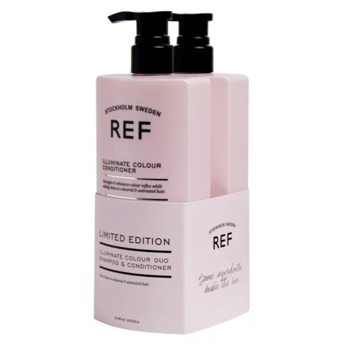 Шампунь и кондиционер с системой сохранения цвета, активными компонентами протеинами киноа, маслами льна и асаи – это деликатная очистка и питание волос, защита цветного пигмента от выгорания. Сохранить яркость и сияние цвета локонов легко, если твои помощники – бьюти-продукты из серии Illuminate Colour REF! Применение: Illuminate Colour Shampoo Тщательно умассируйте шампунь во влажные волосы и смойте. Для завершения восстановления и лечения волос используйте кондиционер Illuminate Colour Conditioner или другой кондиционер REF. Illuminate Colour Conditioner После мытья шампунем Ref Illuminate Colour Shampoo или другим шампунем нанесите кондиционер на влажные волосы и оставьте на 1 минуту. Тщательно смойте.