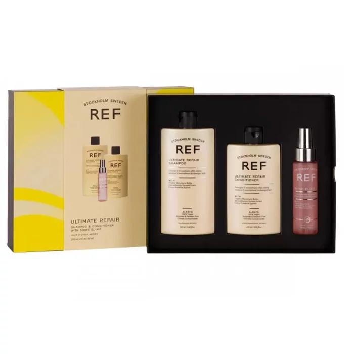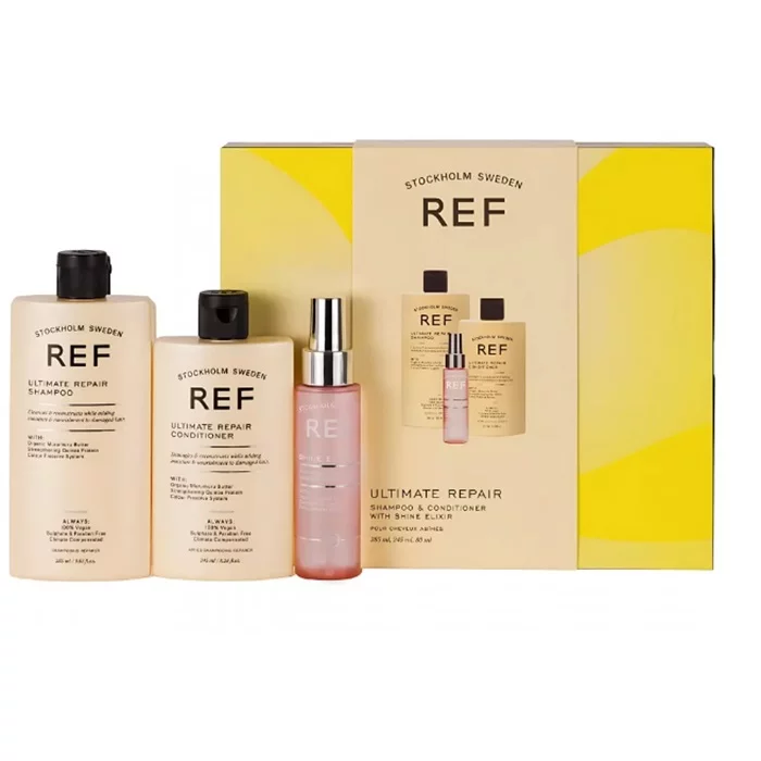 Подарочный набор REF Ultimate Repair создан для сухих и поврежденных волос и является идеальным подарком, который можно презентовать близким или побаловать себя, будь то праздник, день рождения или другой особый случай. Продукты набора содержат уникальную формулу с растительными экстрактами, которые защищают, укрепляют и восстанавливают волосы после химической обработки и использования термоукладочных инструментов. Кроме того, они содержат укрепляющие протеины, которые смягчают волосы, придают им красивый блеск и сохраняют цвет. Яркие цвета и изысканные детали этого набора отражают стиль бренда: красивый, естественный и увлекательный дух.
