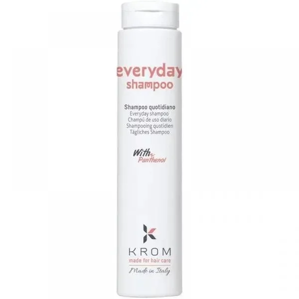 Профессиональный шампунь для ежедневного ухода с пантенолом Krom Everyday Shampoo – это идеальный выбор для очищения жирной кожи головы и поврежденных волос. Он эффективно устраняет избыток себума, пыли, бактерии, ороговевшие дольки и остатки стайлинга. Косметический продукт содержит ингредиенты натурального происхождения и пантенол, поэтому оказывает на локоны очень благоприятный эффект. Он способствует нормализации работы сальных желез, активизирует рост завитков и препятствует образованию перхоти.