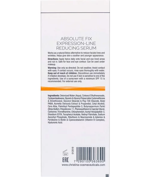 Сыворотка восстанавливает кожу и заполняет морщинки изнутри. Формула также включает антиоксиданты, увлажняющие, смягчающие и лифтинговые ингредиенты (масло Ши, гиалуроновая кислота, витамины С, Е, А, гр. В). В состав сыворотки Absolute Fix входит миорелаксант аргирелин, который сохраняет неповторимую индивидуальность лица. Сыворотка Абсолют фикс: снимает излишнее нервное напряжение лица, улучшает текстуру кожи и ее цвет, сокращает имеющиеся морщинки и замедляет появление новых, повышает упругость кожи.