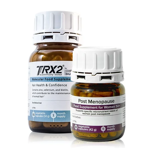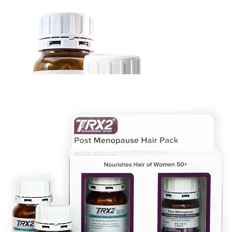 Что такое TRX2® Набор диетических добавок против выпадения волос у женщин в постменопаузальный период? Это сочетание килинически протестированной TRX2 Молекулярной диетической добавки против выпадения волос и Молекулярного комплекса для женщин в период постменопаузы. TRX2® содержит запатентованный комплекс, состоящий из калия, Carnipure® тартрата (L-карнитин тартрат), аминокислот с разветвленными боковыми цепями, никотинамида и необходимых питательных веществ. TRX2® используется для поддержания нормального, здорового состояния волос и обеспечивает питание Ваших волос необходимыми питательными веществами. Молекулярный комплекс для женщин в постменопаузальный период специально разработан для обеспечения потребности в микроэлементах женщинами во время и после менопаузы с целью улучшения общего состояния питания клеток фолликул волос. Он содержит мощные природные нутриенты, помогающие сбалансировать гормональное состояние: витамины B6, B5, B9,B12, D, кальций, изофлавоны сои, лигнаны, магний, йод. Как следует принимать TRX2® Набор диетических добавок против выпадения волос у женщин в постменопаузальный период? Рекомендуется принимать по 3 капсулы TRX2 и 2 капсулы Молекулярного комплекса для женщин в период постменопаузы в сутки во время еды, запивая стаканом воды. Вы можете принимать 5 капсул вместе или по отдельности. Рекомендуем разделить прием трех капсул TRX2 в течение дня с основными приемами пищи и принимать 2 капсулы Молекулярного комплекса для женщин в период постменопаузы утром во время еды. Какие возможны побочные реакции после приема? Ингредиенты капсул TRX2® Набор диетических добавок состоит исключительно из веществ, которые естественно содержатся в пищевых продуктах и не относятся к лекарственным средствам. Побочные эффекты сообщаются только в редких случаях. Иногда потребители сообщают о неприятных кишечно-желудочных ощущениях, таких как расстройство желудка, поэтому мы рекомендуемпринимать препарат с едой. В редких случаях наблюдается возникновение аллергических реакций, таких как покраснение кожи. Если возникает какая-либо нежелательная реакция при приеме препарата, его необходимо немедленно прекратить и проконсультироваться с врачом или другим квалифицированным специалистом в области здравоохранения. Сколько времени нужно, чтобы заметить первые результаты? Результаты от употребления TRX2® Набор диетических добавок проявляется индивидуально. Однако первые заметные результаты улучшения состояния волос можно ожидать через 3 месяца после начала приема молекулярной диетической добавки при условии соблюдения всех рекомендаций по применению.* В чем заключается научное обоснование действия TRX2® набора диетических добавок? TRX2® действует на калиевые каналы, небольшие порообразующие белковые структуры, контролирующие транспортировку ионов калия через клеточную мембрану волосяного фолликула. Недавние исследованияпродемонстрировали, что по мере того как у людей возникает истончение волос, функция калиевых каналов в волосяных фолликулах ухудшается. После менопаузы у женщин снижается уровень кальция и изменяется метаболизм гормонов, что повышает риск выпадения волос по женскому типу. Молекулярный комплекс для женщин в постменопаузальный период содержит питательные вещества, удовлетворяющие особые потребн