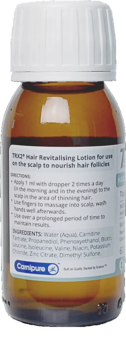 Лосьон TRX2® создан для восстановления волосяных фолликул и питания жидких волос. Основой TRX2® Лосьона является та же эффективная формула, используемая в TRX2® Молекулярной пищевой добавке для волос. Для мужчин и женщин, наблюдающих потерю волос на ранних стадиях (шкала Норвуда 1–4). Не содержит вредных компонентов. Не содержит синтетических ароматизаторов и красителей. Протестирован под дерматологическим контролем немецким институтом дерматологии Dermatest® в 2018 году. Не тестировано на животных Применение Наносите TRX2® Лосьон на кожу головы с помощью пипетки дважды в день: утром и вечером. Не требует смывания. Для обеспечения длительного результата используйте TRX2® Лосьон систематически. Эффективно сочетается с другими продуктами из линейки TRX2®. Состав Аква, Карнитин тартрат, Пропанедиол, Феноксиетанол, Биотин, Леуцин, Изолецин, Валин, Ниацин, Потассиум хлорид, Цинк Цират, Диметил Сульфон. Без синтетических ароматизаторов икрасителей. Предостережение При контакте с глазами немедленно промойте их холодной водой. При возникновении непредсказуемого сильного раздражения прекратите использование лосьона и обратитесь к врачу. Хранить в недоступном для детей месте. Исключительно для наружного использования. Срок годности: 30 месяцев Условия хранения: при комнатной температуре. Не использовать по истечении срока годности. Избегайте попадания прямого солнечного света.