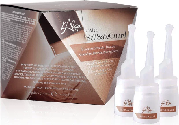 Предохраняет волосы до, во время и после химической обработки от любых повреждений. Восстанавливает поврежденные кератиновые связи после каждой химической обработки. THERMAL PROTECTOR обеспечивает волосам силу, мягкость, гладкость и шелковистость после каждой технической процедуры. Обогащен комплексом AlgaNord5™ Защита волос необходима, так как их красота и здоровье постоянно подрываются ежедневной укладкой, которая повреждает структуру и внутренние кератиновые связи. Без постоянной защиты целостность, крепость, блеск и мягкость волос исчезают через 3-5 недель (в зависимости от способа обработки волос). Использование L'Alga.SelfSafeGuard гарантирует жизнеспособность волос, компактную структуру, целостность, мягкость и блеск до следующего посещения салона. НЕ СОДЕРЖИТ СУЛЬФАТЫ И ПОРАБЕНЫ Представлен в двух форматах: - набор SelfSafeGuard, содержащий 3 ампулы; – L’Alga.SafeGuard объемом 300 мл. Состав L’Alga SelfSafeGuard Уход-термозащита при химической обработке волос AQUA (WATER),SODIUM LANETH-40 MALEATE/STYRENE SULFONATE COPOLYMER, DMDM HYDANTOIN, PHENOXYETHANOL, POTASSIUM SORBATE, CITRIC ACID, VEGETABLE BUTYLENE GLYCOL, BUTYLENE GLYCOL, PROPYLENECHL MUSCIFORMIS EXTRACT, HYDROLYZED RHODOPHYCEAE EXTRACT, ALARIA ESCULENTA EXTRACT, PARFUM (FRAGRANCE), LAMINARIA DIGITATA EXTRACT, PELVETIA CANALICULATA EXTRACT, LITHOTHAMNION CALCAREUM EXTRACT (LITHOTHAMNIUM CALCAREUM EXTRACT) Применение L’Alga SelfSafeGuard Уход-термозащита при химической обработке волос Восстановление волос: вымыть волосы шампунем L'ALGA.SEAWET Shampoo, промокнуть полотенцем. Смешать 7,5 мл средства по уходу SafeGuard с одной дозой кондиционера L'ALGA.BOOST Conditioner или маской L'ALGA.SEACURE Mask, равномерно нанести на волосы и тщательно прочесать. Оставить на 10-15 минут. Затем смыть.