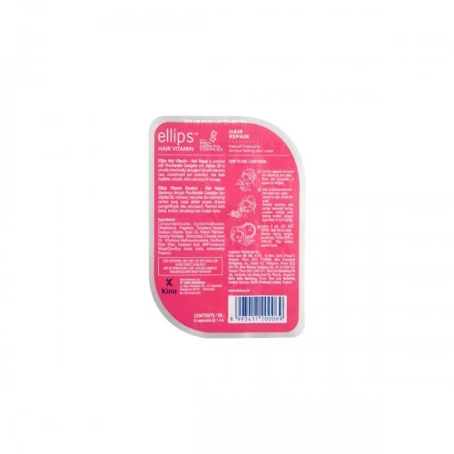 Ellips Hair Vitamin Hair Repair With Pro-Keratin Complex Витамины для волос "Восстановление волос" Желание выглядеть сверхпривлекательно заставляет девушек регулярно использовать термоприборы для укладки волос, например фен, плойку и стайлер. Высокие температуры не лучшим образом влияют на структуру волос, пересушивают их, провоцируя ломкость и секущиеся кончики. Чтобы восстановить и защитить локоны от повреждения - воспользуйтесь Hair Vitamin Hair Repair With Pro-Keratin Complex от Ellips. Действие витаминов для волос направлено на интенсивное восстановление структуры. Обогащенная маслом жожоба формула обволакивает каждый волосок, препятствуя испарению влаги. Специальный Pro-Keratin Complex улучшает состояние и внешний вид поврежденных вследствие химической завивки или термической обработки локонов. Способ применения Вымыть волосы, просушить полотенцем, открыть с помощью ножниц 1 капсулу и нанести на влажные волосы. Не смывать. Сушить и укладывать волосы обычнымспособом. Состав Cyclopentasiloxane, Cyclotetrasiloxane, Dimethiconol, Fragrance, Tocopheryl Acetate, Soybean (Glycine Soja) Oil, Retinyl Palmitate, Ascorbyl Palmitate, Simmondsia Chinensis Seed Oil, Ethylhexyl Methoxycinnamate, Panthe at/Corn/Soy Amino Acids, Aminomethyl Propanol.